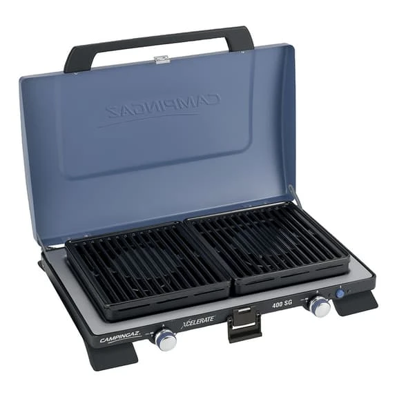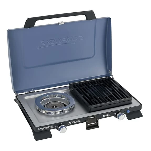 La cucina portatile Campingaz Serie 400 con Grill Xcelerate con due fuochi integrati Campingaz con un design e una tecnologia che migliorano il rendimento della cottura. Gode di un’ampia gamma di opzioni di cucina esterna, facile da accendere con avvio elettrico. La fiamma del gas è potente e alimenta il fornelletto per produrre ottimo calore. In sistema Stopgaz integrato è un dispositivo di sicurezza che blocca la fuori uscita di gas in assenza di fiamma, funziona grazie a una valvola che si apre premendo il pulsante per l’accensione, il calore della fiamma genere una corrente elettrica che mantiene la valvola aperta. Se una raffica di vento o altro, spengono la fiamma, questo meccanismo si raffredda e la corrente elettrica non passa, facendo quindi chiudere la valvola e bloccando il gas.