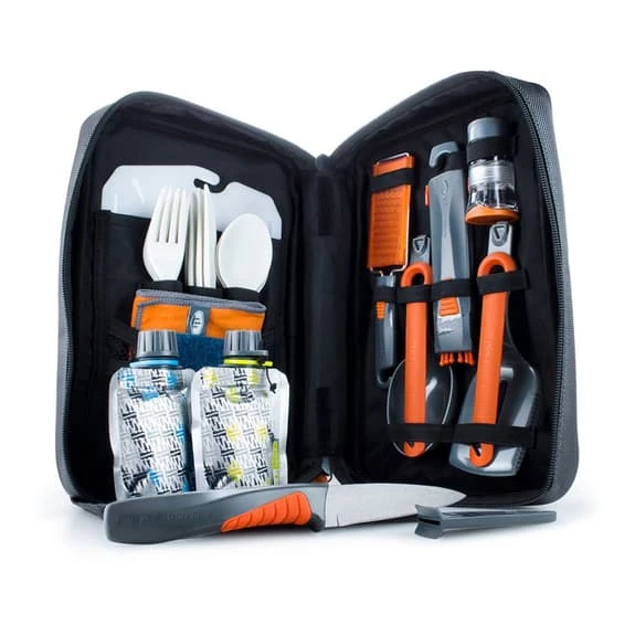 Il kit da cucina GSI Destination Kitchen da 24 pezzi è un servizio per 4 persone, il cucchiaio e la spatola in Nylon 6-6 ad alta temperatura ruotano facilmente da posizione di trasporto a posizione di lavoro. I contenitori di spezie sono impermeabili e ultraleggeri. La resistente custodia esterna in nylon balistico mantiene tutto organizzato.