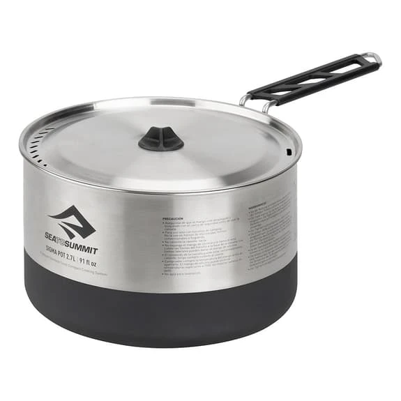 La pentola Sea to Summit Sigma da 2.7L è resistente, leggera grazie all’alluminio anodizzato e dotata di un coperchio con colino integrato e di un manico pieghevole con blocco di sicurezza.