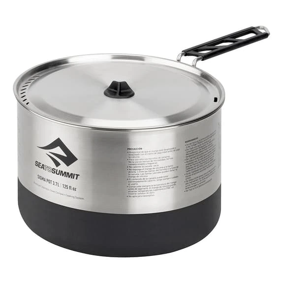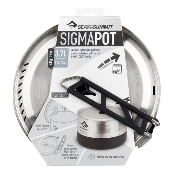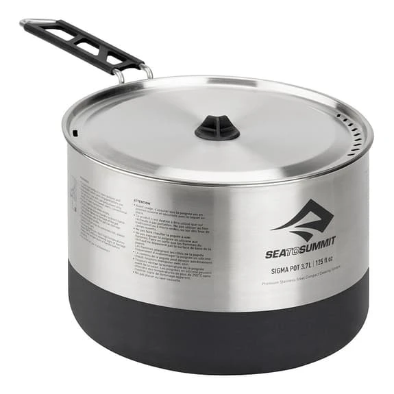 La pentola Sea to Summit Sigma da 3.7L è resistente, leggera grazie all’alluminio anodizzato e dotata di un coperchio con colino integrato e di un manico pieghevole con blocco di sicurezza.