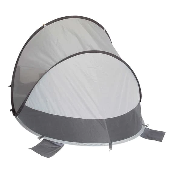 La tenda a conchiglia Calobra 80 di High Peak offre una protezione con fattore UV 80 secondo la norma UV 801. Il tessuto del tetto è rivestito di alluminio all’interno e funge da riflettore di calore. Gli ampi pannelli in rete garantiscono una buona brezza e tengono lontano il calore. Montaggio e smontaggio rapidi grazie alle aste in fibra di vetro integrate.