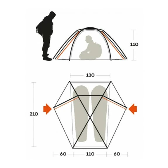 – Materiali: Doppio tetto in Poliestere Ripstop 70D, 85g/m2, rivestito in poliuretano alluminato termoisolante, impermeabilità 3000 mm, resistente all’acqua, trattato FR