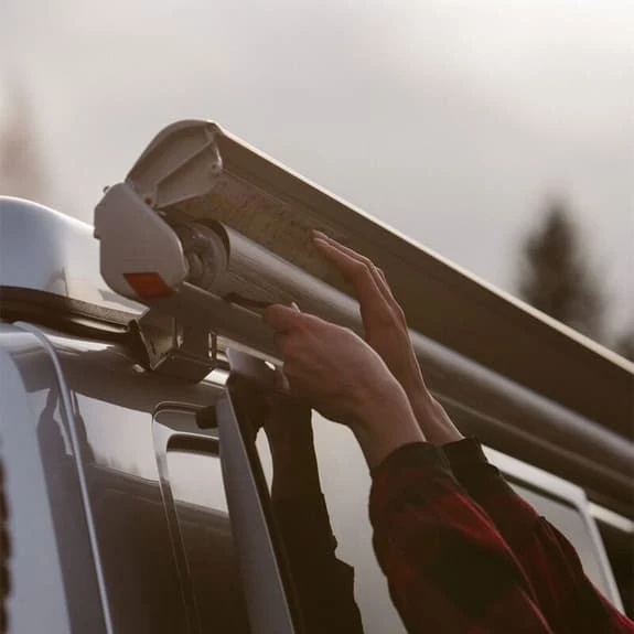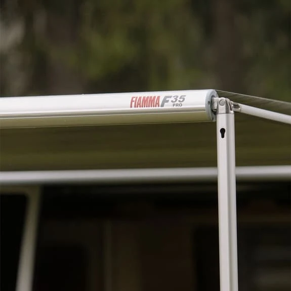 Il tendalino Fiamma F35pro gode di una robusta carcassa in alluminio anodizzato leggero con meccanismo manuale.